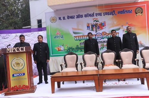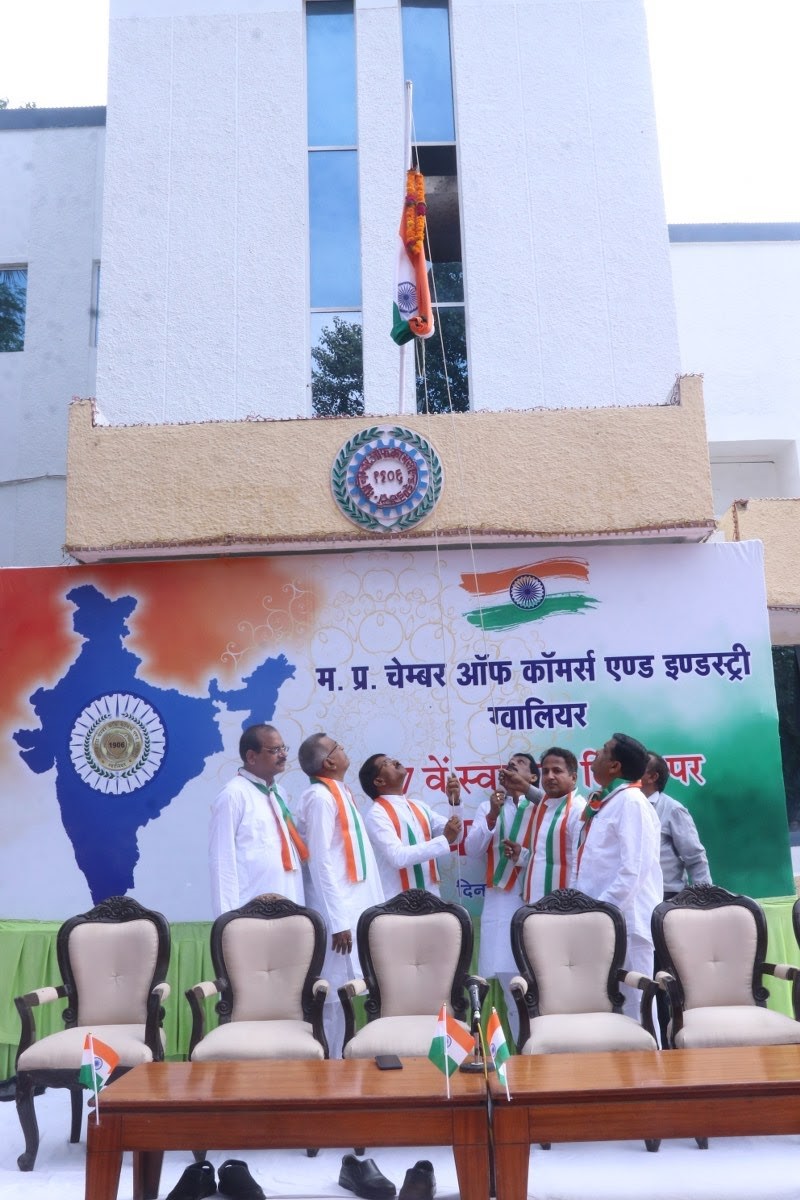 ग्वालियर 16 अगस्त, 2024। 78वें स्वतंत्रता दिवस के अवसर पर मप्र चेम्बर ऑफ कॉमर्स एण्ड इण्डस्ट्री (MPCCI) के अध्यक्ष-डॉ. प्रवीण अग्रवाल द्बारा ‘चेम्बर भवन’ पर ध्वजारोहण किया गया।