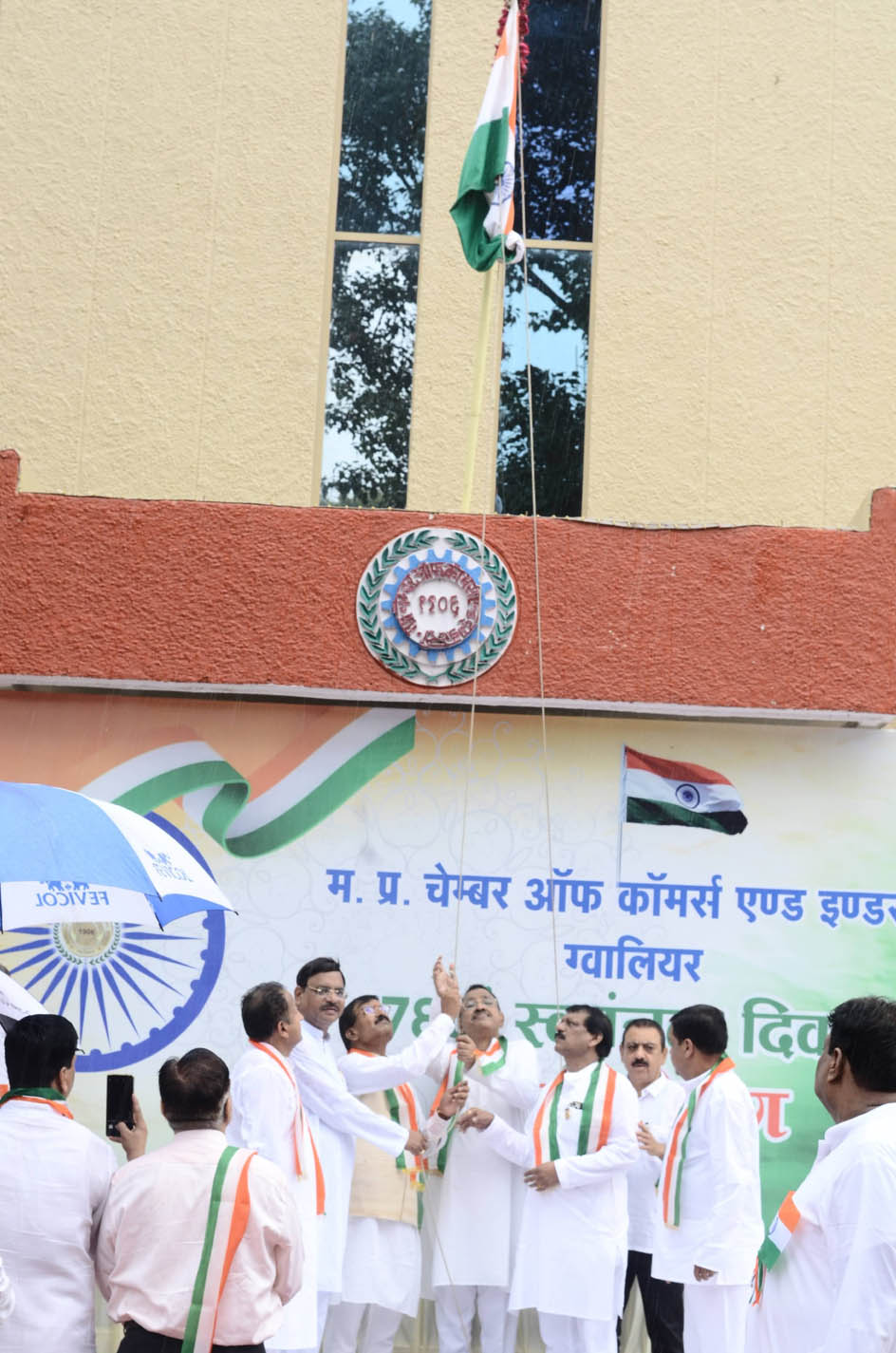 ग्वालियर 16 अगस्त, 2024। 78वें स्वतंत्रता दिवस के अवसर पर मप्र चेम्बर ऑफ कॉमर्स एण्ड इण्डस्ट्री (MPCCI) के अध्यक्ष-डॉ. प्रवीण अग्रवाल द्बारा ‘चेम्बर भवन’ पर ध्वजारोहण किया गया।